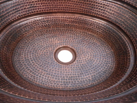 SimplyCopper 16" Oval BUCKET design is created of 18-gauge copper, which is hand-hammered to provide a rustic antiqued look. Matching faucets and drains are available. This copper sink is installed as a vessel.