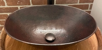 SimplyCopper17” elegant oval bowl design, created of 18-gauge copper which is hand-hammered to provide a rustic antiqued look. This copper sink is installed as a vessel