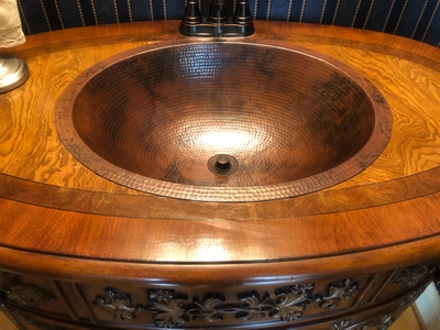 SimplyCopper 19" x 14” is a Oval design, created of 18-gauge copper which is hand-hammered to provide a rustic look This sink is perfect for a a Master Bath orWine and Whiskey Barrels. This copper sink can be used as either a drop- in or an under mount.