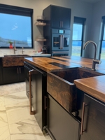 SimplyCopper wants you to Design with the Sink in Mind. This Rustic Farmhouse kitchen sink is hand forged from 16-gauge copper, and 14-gauge copper for the apron. This sink is hand-hammered and fired to achieve a gorgeous patina.