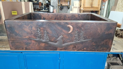 Copper Kitchen Farmhouse Sink Single Well Howling Wolf Design