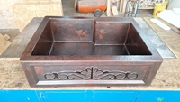 SimplyCopper wants you to Design with the Sink in Mind. This Rustic Farmhouse kitchen sink is hand forged from 16-gauge copper, and 14-gauge copper for the apron. This sink is hand-hammered and fired to achieve a gorgeous patina.