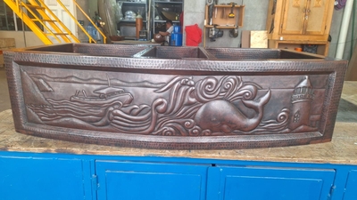 SimplyCopper wants you to Design with the Sink in Mind. This Rustic Triple Bowl Farmhouse kitchen sink is hand forged from 16-gauge copper, and 14-gauge copper for the apron. This sink is hand-hammered and fired to achieve a gorgeous patina.